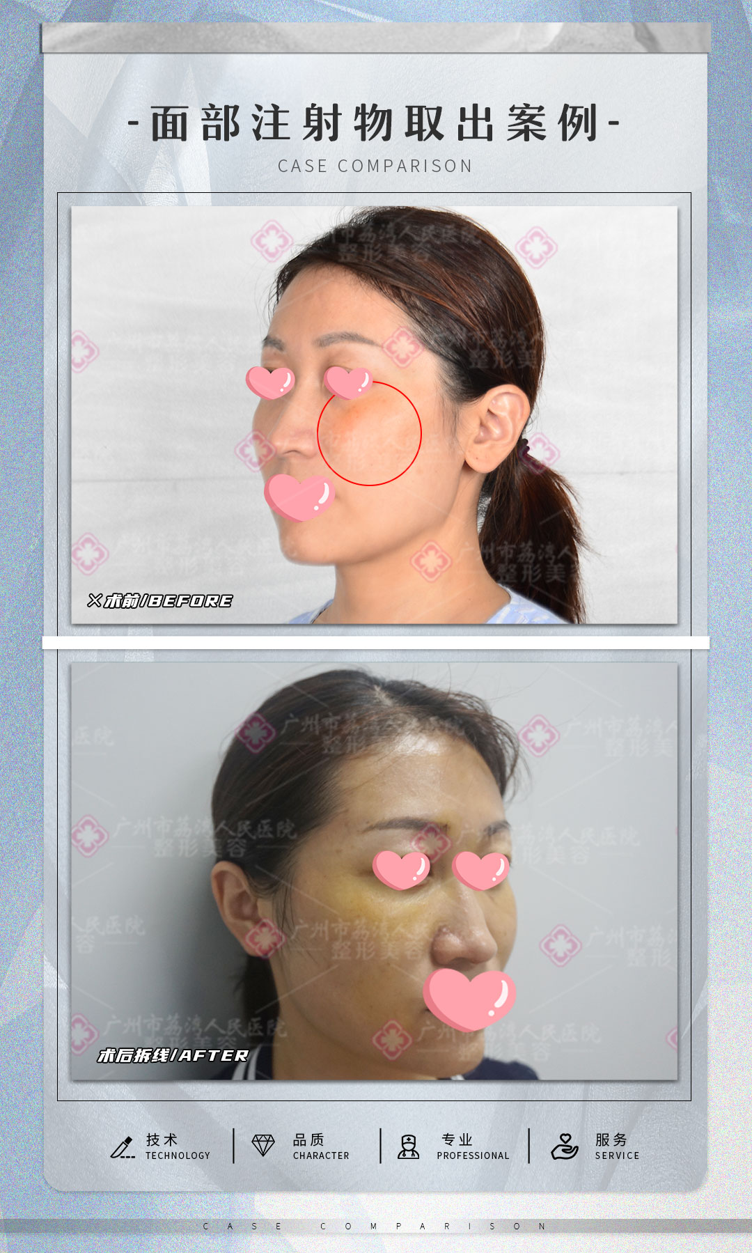 注射物不是你想取就能取,尤其是伴随并发症的取出,也不是谁都能取出的,只有选择专业的医生,用恰当的方式才能取出。有些患者一旦出现并发症,甚至是得知自己注射的是不明注射物,就慌了,然后开始盲目的去做取出,又是抽吸又是溶解的,结果没有取出注射物不说,反而又增添了新的不适症状。