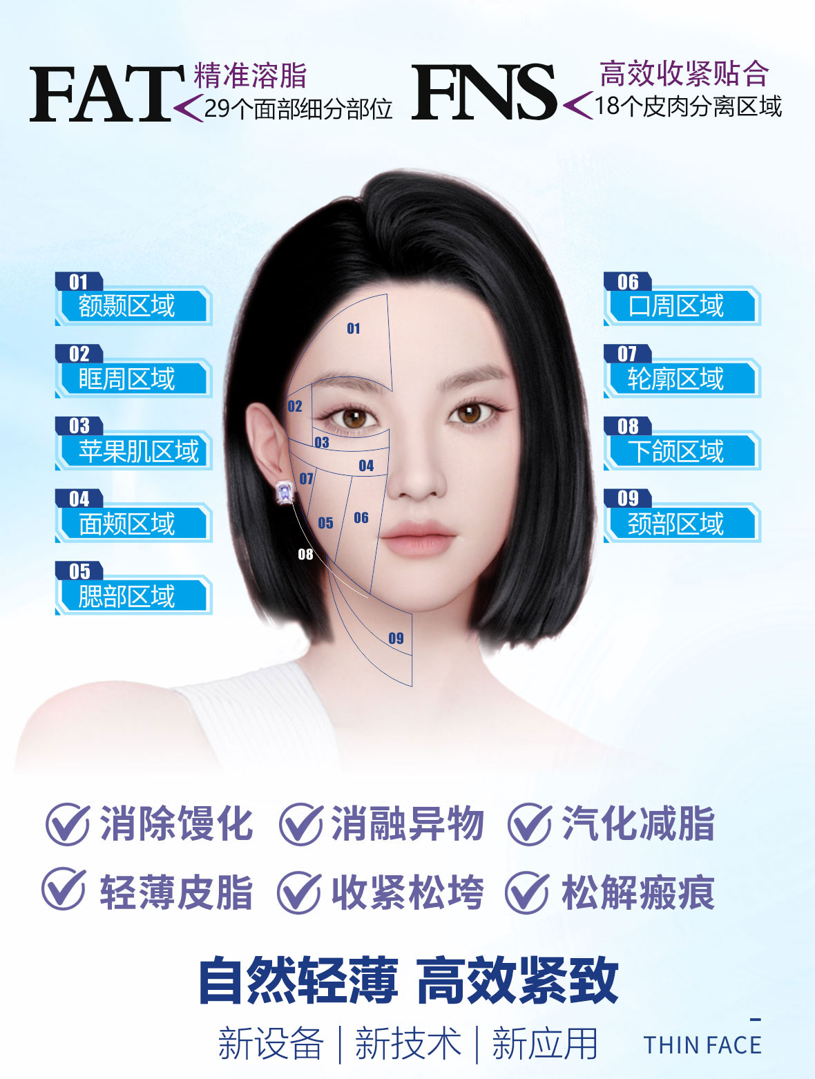 我们的核心优势:软组织消融术安全消融多余脂肪,采用100kHZ医学射频技术,精细化定点定位,精准汽化消融组织异物,高效修复面部馒化问题。轻盈减容术轻薄贴合紧致肌肤,消除馒化,轻薄皮脂的同时进行平整修复,术后皮肤平整度高,面部轻薄紧致,“皮骨”轻盈贴合。纤维网重塑术高效重塑轮廓曲线:重建纤维网支撑架构,刺激纤维组织新生重组,实现最大程度组织复位、紧致提升轮廓流畅自然,减容、紧致塑形三位一体。